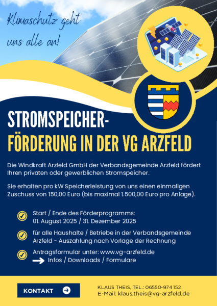 Die Windkraft Arzfeld GmbH der Verbandsgemeinde Arzfeld fördert Ihren privaten oder gewerblichen Stromspeicher.